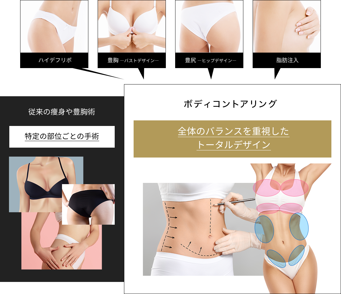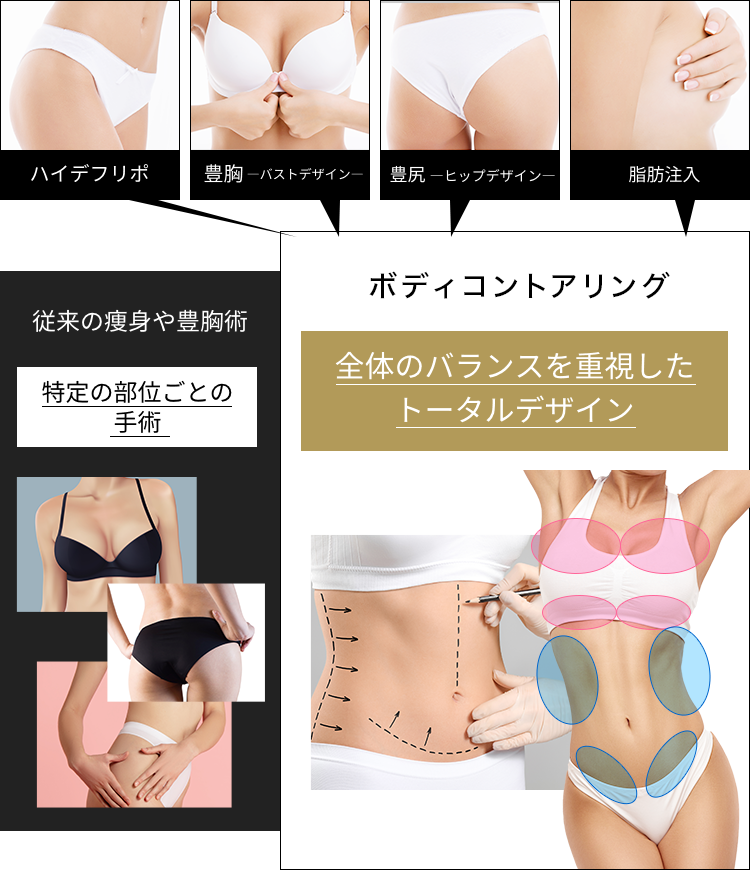 ボディメイキングに特化したクリニックとして、脂肪吸引・バストやヒップをはじめとするボディデザインの手術を行っています。