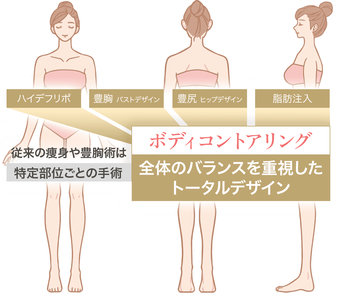 従来のフラットに脂肪を除去する痩身や、バスト・ヒップのボリュームアップを目的とした施術とは一線を画す、理想の身体を造り上げるトータルプログラムです。